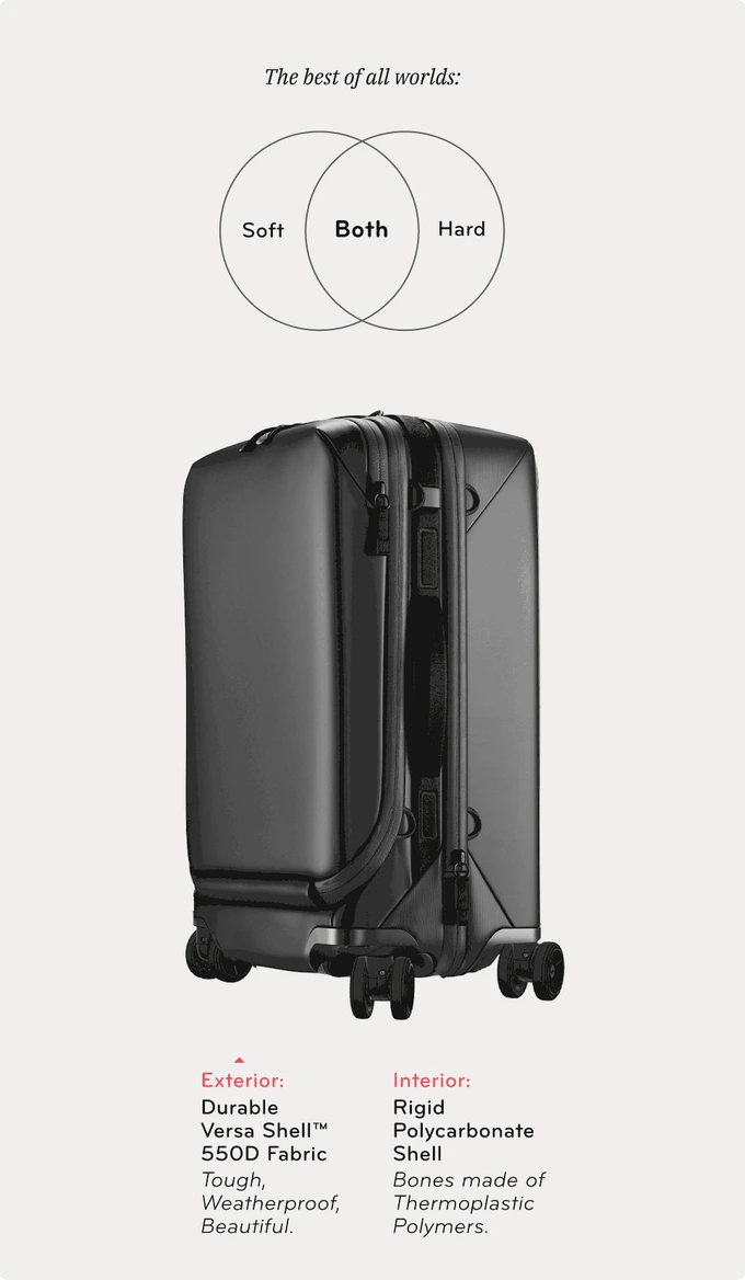 The Roller Pro's hybrid construction gives you the best of both the hard roller and soft roller worlds. The outside of the bag is made of our durable Versa Shell™ 550D Fabric, the culmination of our years of Peak Design bag design experience. Versa Shell™ is weatherproof, durable, and beautiful. Plus it is 100% recycled and Bluesign-approved!